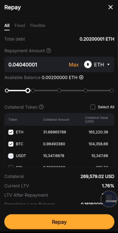Flexible Rate Loan and Fixed Rate Loan can be repaid at any time, either in full or in part. For Flexible Rate Loan, the interest is calculated based on the actual borrowing duration, and any period less than one hour is rounded up to a full hour. For Fixed Rate Loan, the interest charged upfront when the loan was confirmed is non-refundable.