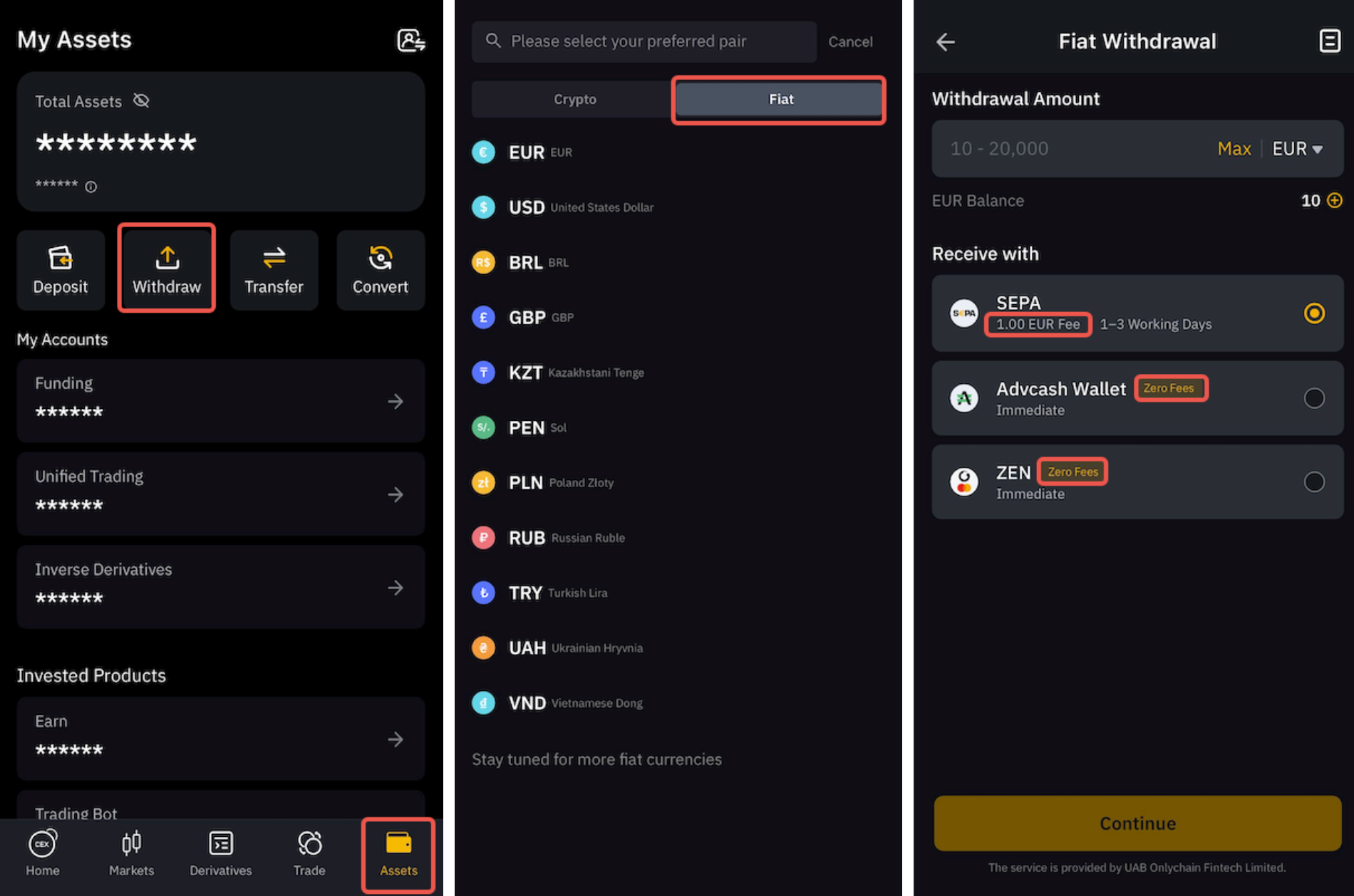 There may be fees associated with your fiat withdrawal depending on the fiat currency and payment method selected. You can find the relevant fee rates applied for each fiat currency and payment method by going to the Fiat withdrawal page and selecting the fiat currency of your choice.