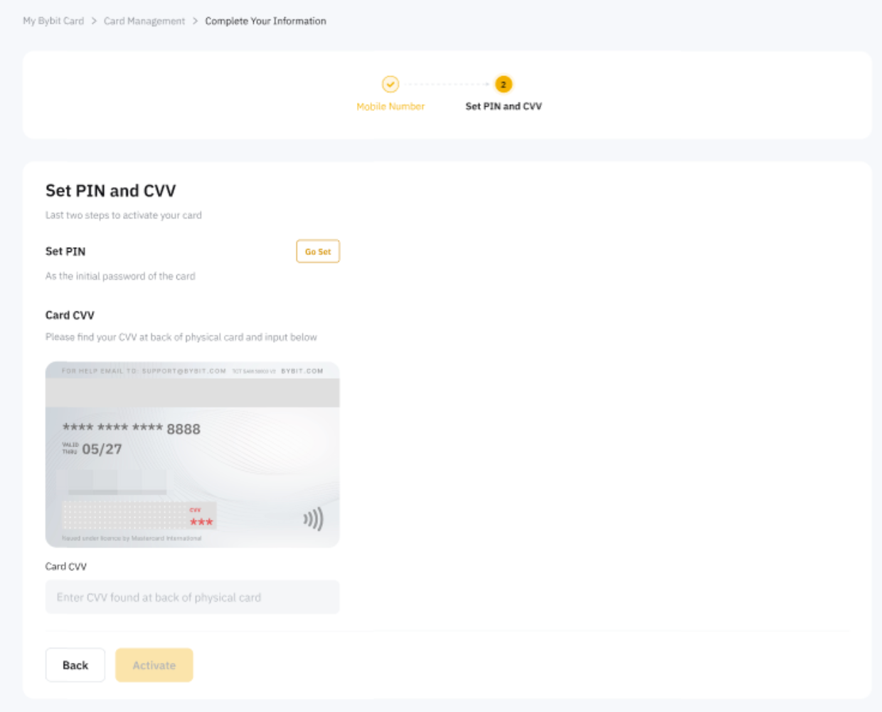 Step 5: Enter the 3-digit CVV on the back of your physical Bybit Card and click on Activate.