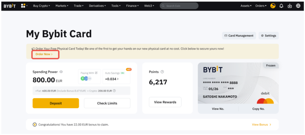 Step 1: Go to FinanceCard. Click on Order New on the physical Bybit Card Application banner.