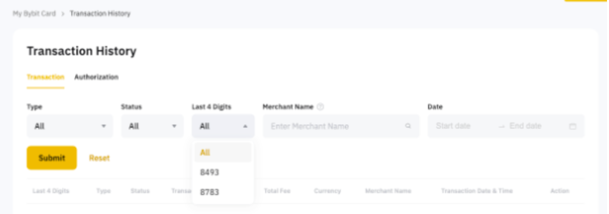 Note: The transaction history includes both virtual and physical cards. You may filter them by the last 4 digits of your card if you prefer to view either one of the card transactions.