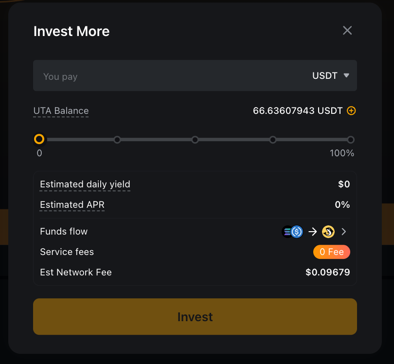 Step 4: Enter the amount of cryptocurrency you wish to invest in the selected liquidity pool, then click Invest and confirm your order.