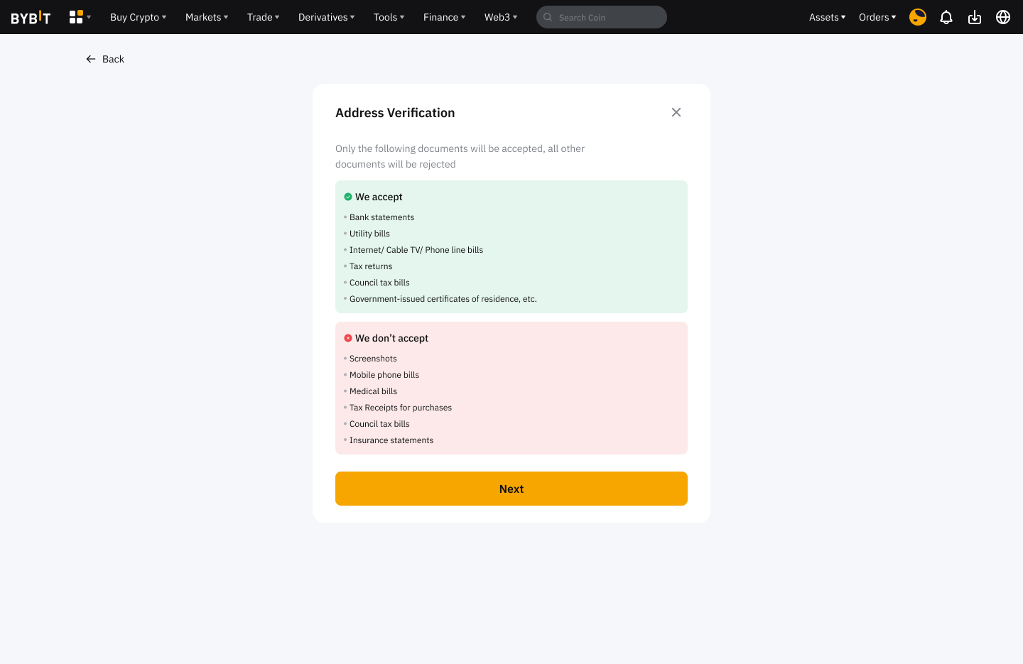 Step 5: Tap Next to submit your updated Proof of Address by completing the Advanced Verification process as usual.