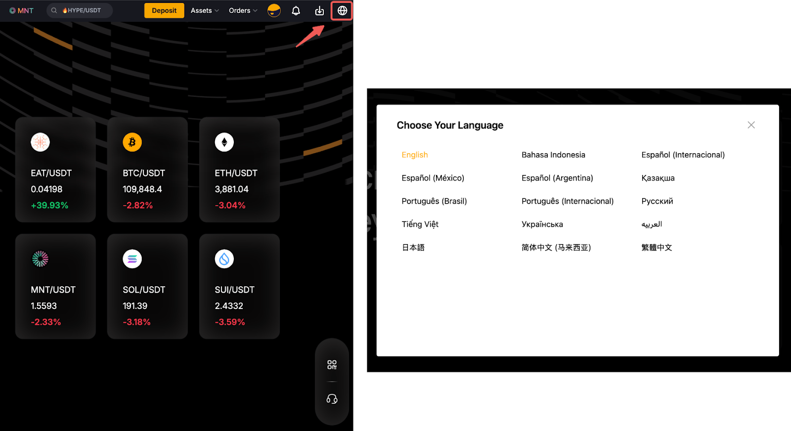 On the top right corner of the website, click on the globe icon to open the list of available languages and select your preferred language.