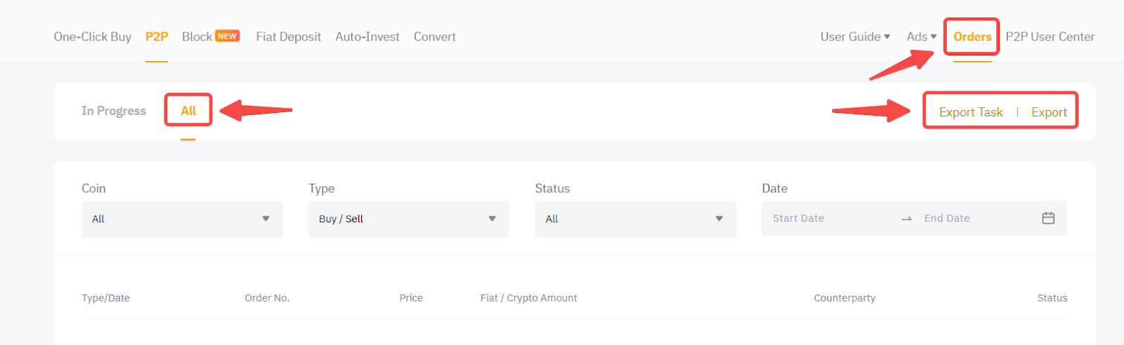 You can export information about your P2P orders by clicking on the Export button in the upper right corner of this page. Please note that the Export function is available only on the Bybit website.