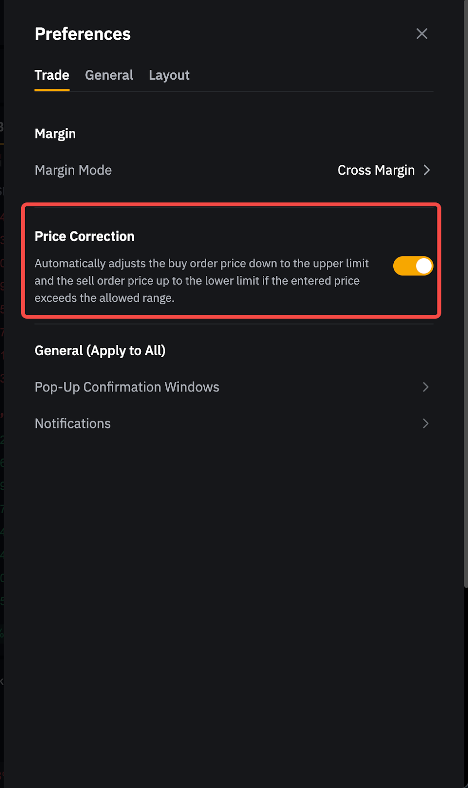 Для лимитного ордера: Если цена ордера на покупку (или продажу) выше (или ниже) лимита цены, ордер будет отменен и не будет выполнен, если вы отключили настройки коррекции цены (по умолчанию). Если вы включили настройки коррекции цены, цена ордера на покупку (или продажу) будет автоматически уменьшена (или увеличена) до верхнего (или нижнего) предела, когда введенная цена превысит допустимый диапазон.