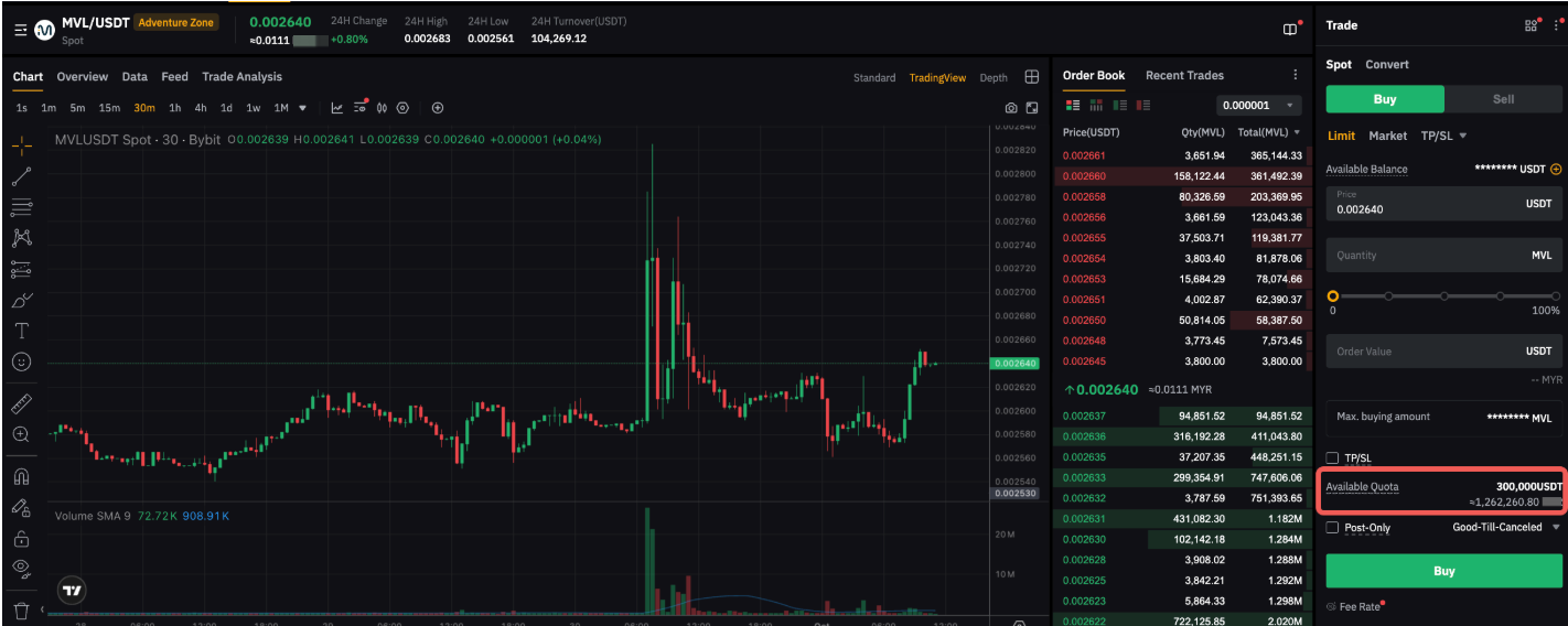 Для иллюстрации, квота ордера для MVL составляет 300 000 USDT, а рыночная цена — 0,002640. Максимальное количество, которое пользователи могут приобрести на спотовом рынке, составляет 113 636 363 MVL (300 000/0,002640). После достижения этой квоты допускаются только ордера на продажу. Любое увеличение стоимости в связи с депозитами или изменением цены после достижения квоты не ограничено. Вы можете просмотреть квоты на ордера в окне спотовых торговых ордеров.