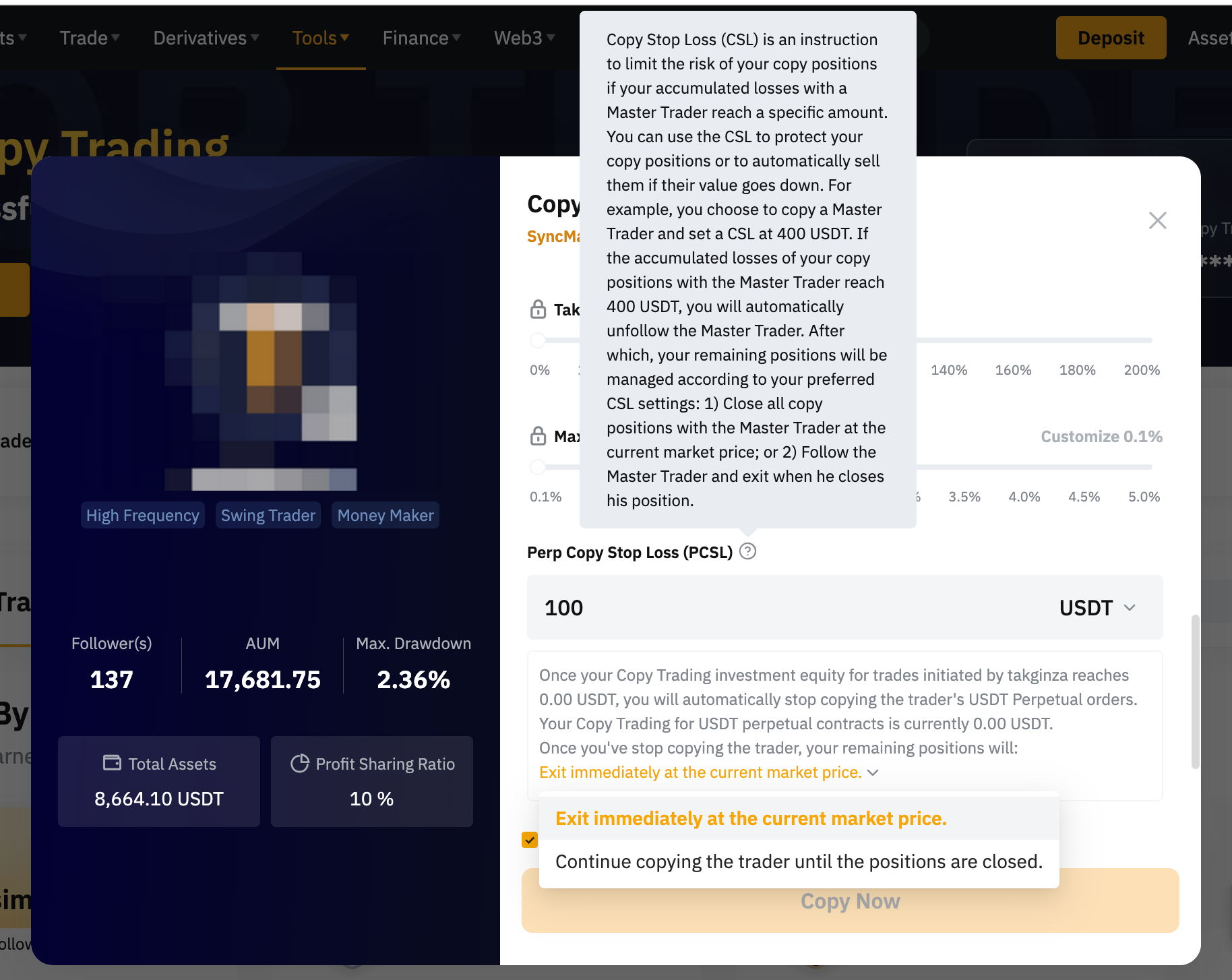 РCSL активируется, когда ваш общий капитал для копирования сделок, указанный в обзоре вашего аккаунта у соответствующего Мастера трейдинга, достигает уровня капитала, основанного на сумме РCSL или установленном процентном соотношении (%). Например, установленная сумма РCSL составляет 400 USDT, текущий капитал составляет 1000 USDT. Когда капитал падает до 600 USDT, срабатывает РCSL, и все ваши позиции соответствующего Мастера трейдинга могут быть немедленно закрыты по текущей рыночной цене или продолжать копирование трейдера, пока позиции не будут закрыты, в зависимости от вашего выбора. После того, как вы отменили копирование Мастера трейдинга, значение РCSL будет сброшено и пересчитано, в случае, если Подписчик снова подпишется на Мастера трейдинга.