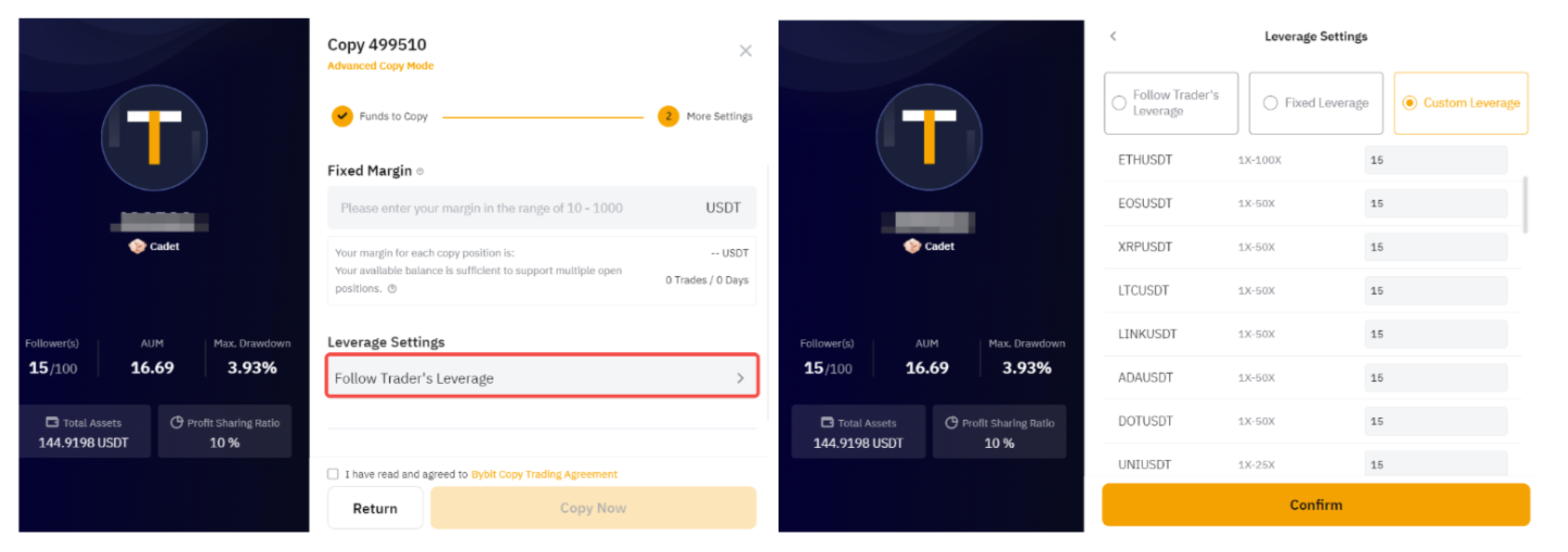 Подписчики могут увеличить сумму инвестиций для Мастера Трейдера, и как только Мастер Трейдер совершит новое торговое действие, например, размещение нового ордера или корректировка кредитного плеча, кредитное плечо будет автоматически поправлено. Однако, если мастер трейдер не совершает никаких новых торговых действий, система не будет автоматически обновлять изменение кредитного плеча для подписчиков. В этом случае вы можете вручную изменить свое кредитное плечо вслед за кредитным плечом Мастера трейдинга, перейдя в соответствующие Настройки копитрейдинга данного Мастера и нажав «Настроить». Это позволит системе перепроверить доступную маржу и перенастроить кредитное плечо.