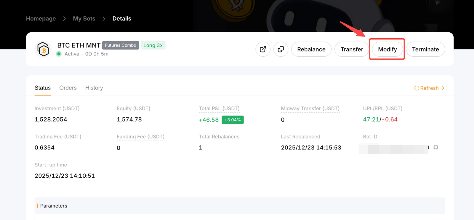 Да. Параметры запущенного Бот Комба Фьючерсов можно изменить на странице Детали Бота. Для начала перейдите в раздел Просмотр моих ботов и найдите активного бота, параметры которого вы хотите изменить. Затем нажмите Детали Изменить.