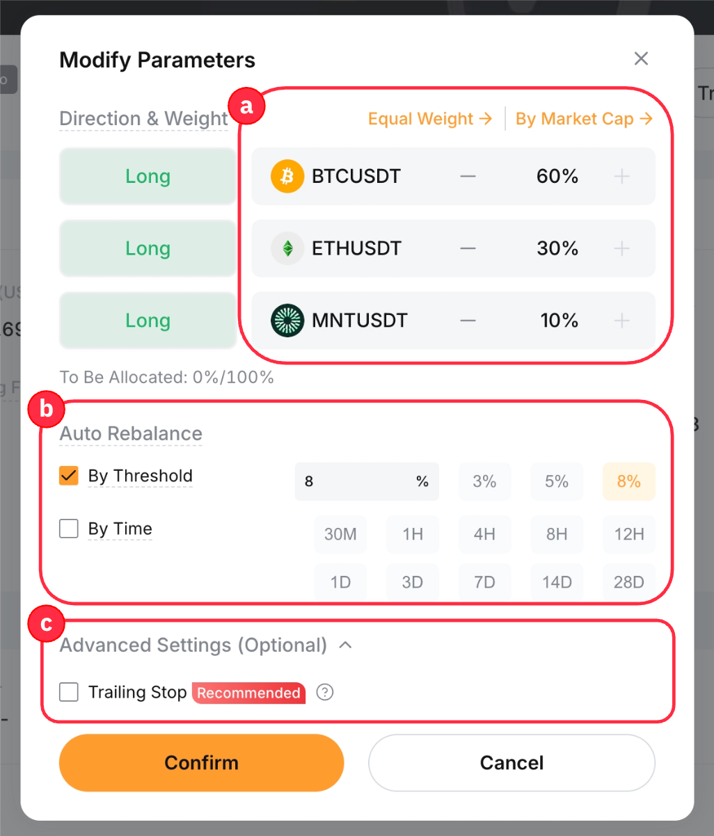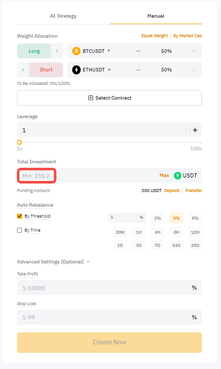 1. Установите пропорцию выбранных контрактов вручную или выбрав один из доступных предустановленных вариантов — равным весом или по рыночной капитализации.