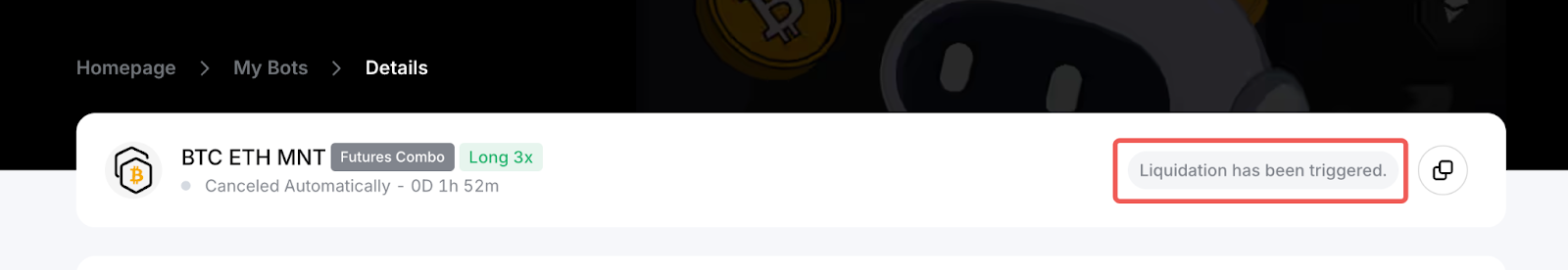 Обратите внимание, что система автоматически прекратит работу бота, и вы увидите сообщение о статусе ликвидации в правом верхнем углу деталей о боте.