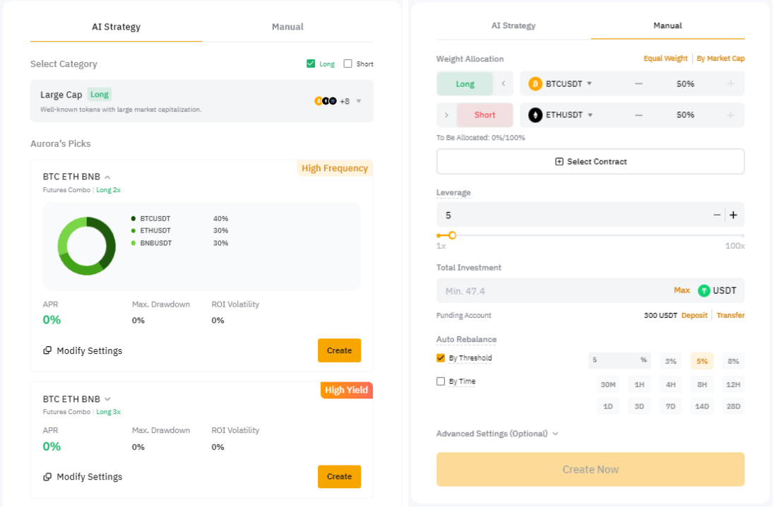 С помощью ботов Комбо Фьючерсов пользователи создают портфели контрактов и управляют ими. Портфель контрактов состоит из не менее чем 2 (двух) и не более 10 (десяти) контрактов. Портфели можно настраивать, устанавливая различные параметры, такие как выбор контрактов, направление торговли, пропорция позиции (с точностью до 1%), размер кредитного плеча и механизмы ребалансировки (пороговые значения для заданных пропорций и/или временные интервалы). Кроме того, для оптимизации торговых решений, ордера можно размещать с помощью ИИ-стратегий.