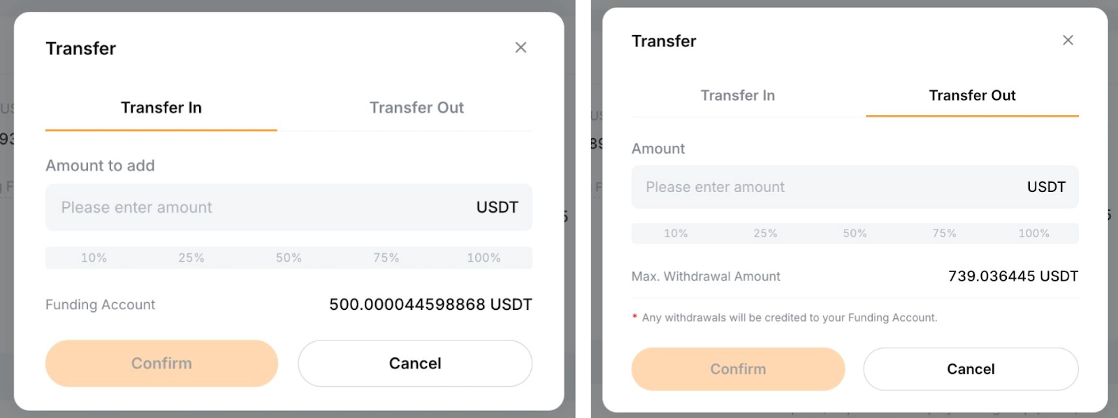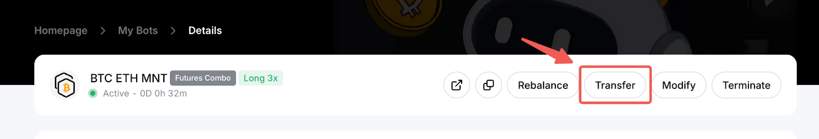 Да, вы можете добавить или снять средства с вашего активного бота Комбо фьючерсов, нажав кнопку Перевод на странице Детали Бота. Просто переключитесь на соответствующую вкладку и задайте сумму в поле ввода или в процентной строке, прежде чем нажать Подтвердить.