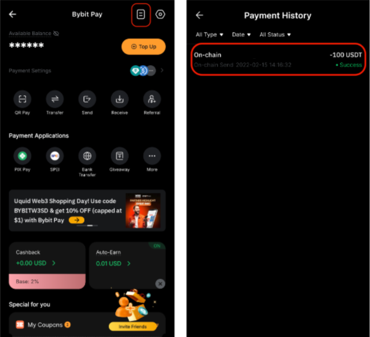 Перейдите на страницу Bybit Pay и коснитесь значка История платежей в правом верхнем углу.