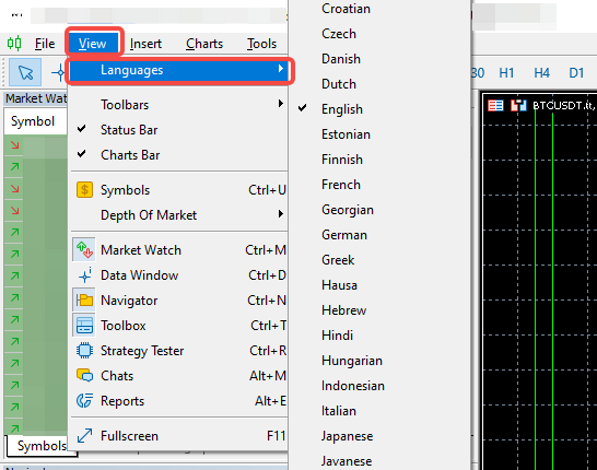 Чтобы изменить язык в клиентском терминале MT5, просто нажмите на меню Просмотра → Языки выберите язык из списка.