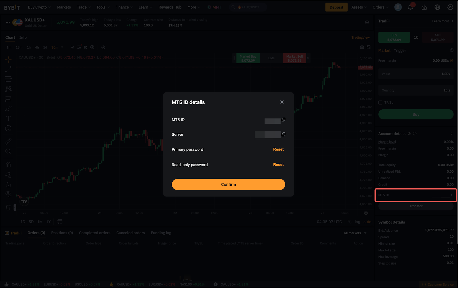 Для беспрепятственного доступа и более удобной торговли TradFi уже интегрирован в ваш аккаунт Bybit. Однако вы по-прежнему можете торговать через клиентский терминал MetaTrader, используя свой ID аккаунта MT5. После успешной активации вашего аккаунта TradFi вы можете проверить данные своего логина, нажав на раздел MT5 ID в разделе Данные аккаунта.