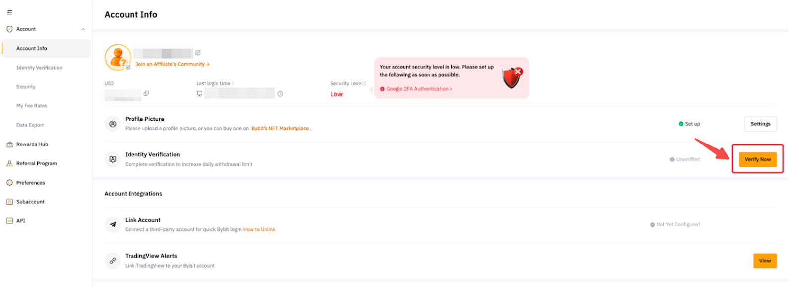 Шаг 2. Нажмите Пройти в колонке Верификация KYC в разделе Информация об аккаунте, чтобы перейти на страницу Верификация личности.