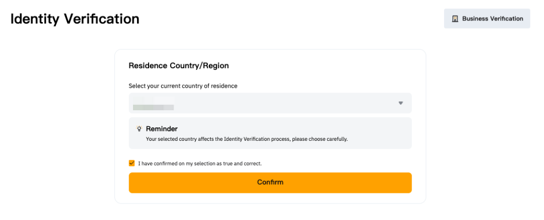 Шаг 3. Выберите страну проживания. Выберите точную страну и регион проживания, поскольку они могут повлиять на процесс верификации. Для внесения изменений после подтверждения может потребоваться дополнительная верификация.