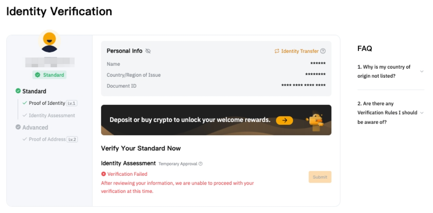 Лица, которые не прошли оценку KYC, не могут пройти стандартную верификацию и, следовательно, не могут получить доступ к продуктам, которые требуют успешного завершения этого процесса верификации.