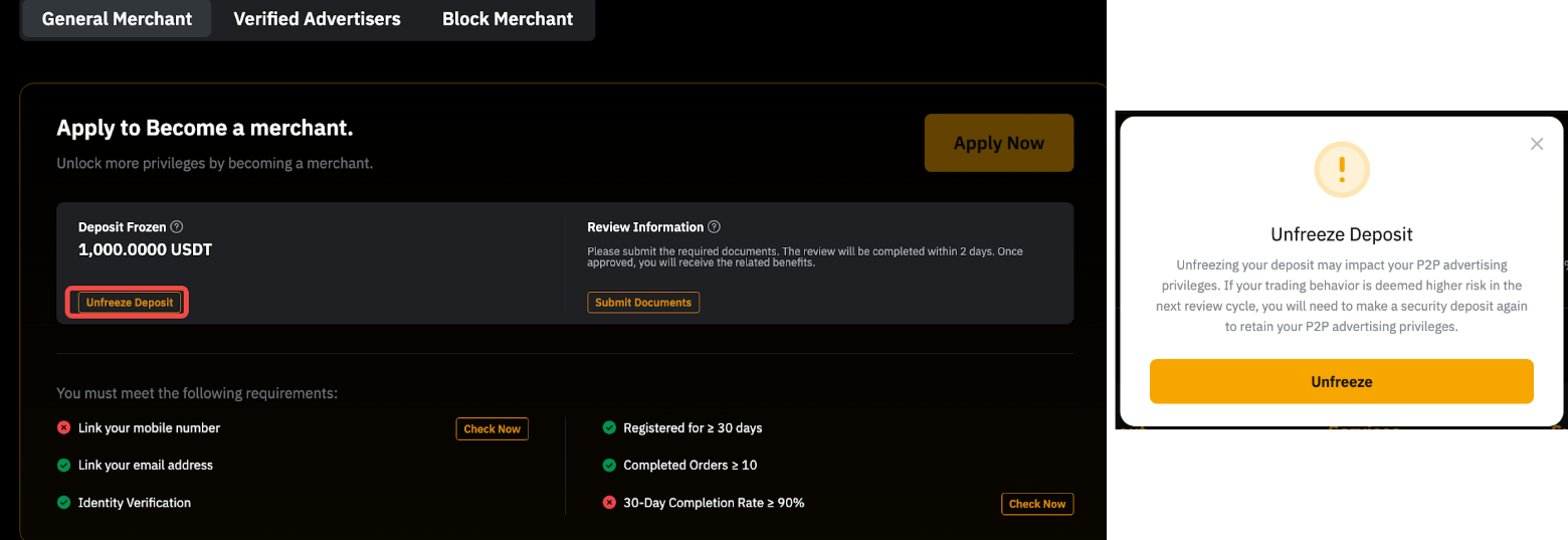 — Имейте в виду, что размораживание депозита лишает вас права на публикацию P2P-объявлений. Для получения дополнительной информации ознакомьтесь с FAQ — Требования к залоговому депозиту в P2P торговле.