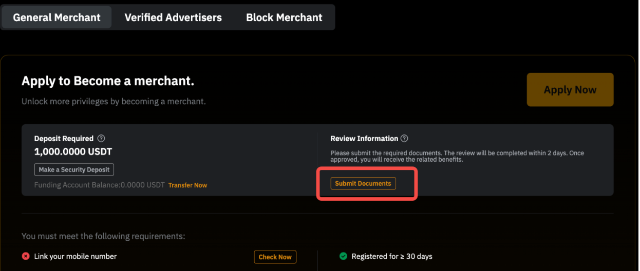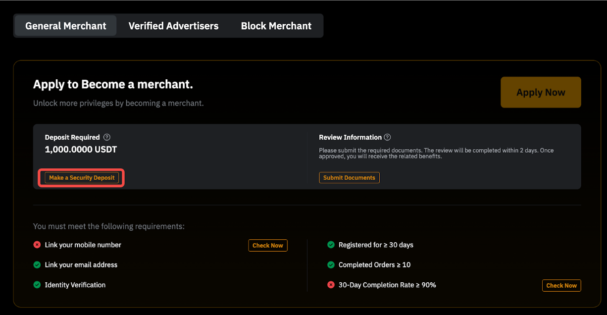 Чтобы повысить безопасность P2P-торговли, пользователи, которые были определены потенциально рискованными в результате нашей комплексной оценки системы, обязаны внести залоговый депозит. Эти пользователи должны предоставить необходимую сумму и заблокировать её на нашей P2P-платформе для сохранения своих P2P-привилегий. Для получения дополнительной информации ознакомьтесь с этим FAQ.