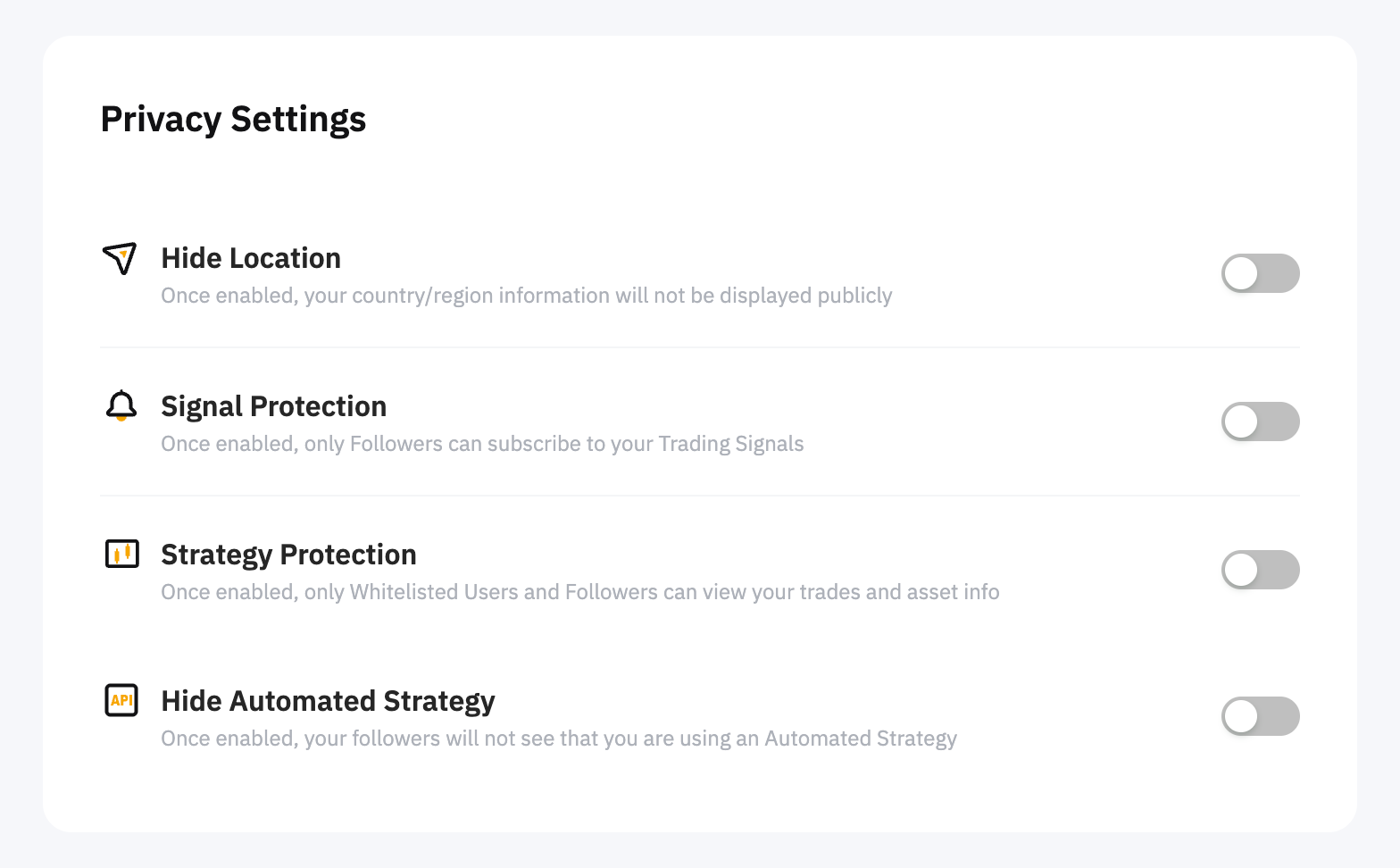 В разделе Настройки конфиденциальности вы можете управлять отображением своего местоположения, защитой сигналов, защитой стратегии или скрыть свою автоматизированную стратегию от общественности.