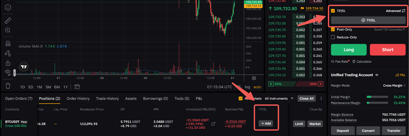 Чтобы установить TP/SL для ваших ордеров при их создании, просто нажмите на Тейк-профит/Стоп-лосс в зоне ордера при создании ордера. Кроме того, можно задать TP/SL для открытой позиции на вкладке позиции. Для получения дополнительной информации смотрите здесь.