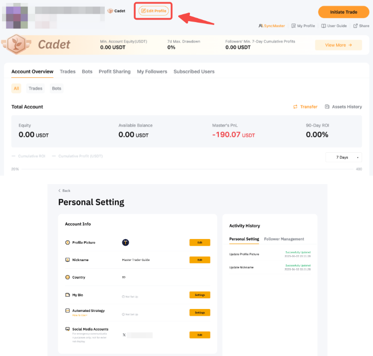 Чтобы перейти на страницу личных настроек, нажмите Мой Копитрейдинг → Изменить профиль для управления информацией о аккаунте, настройками подписчиков и настройками конфиденциальности. Обратите внимание, что для утверждения любых обновлений информации об акаунте потребуется 1–3 рабочих дней.