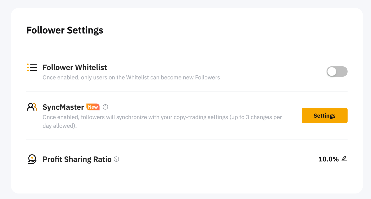 В разделе Настройки подписчиков можно управлять Белым списком подписчиков, SyncMaster и Коэффициентом распределения прибыли.