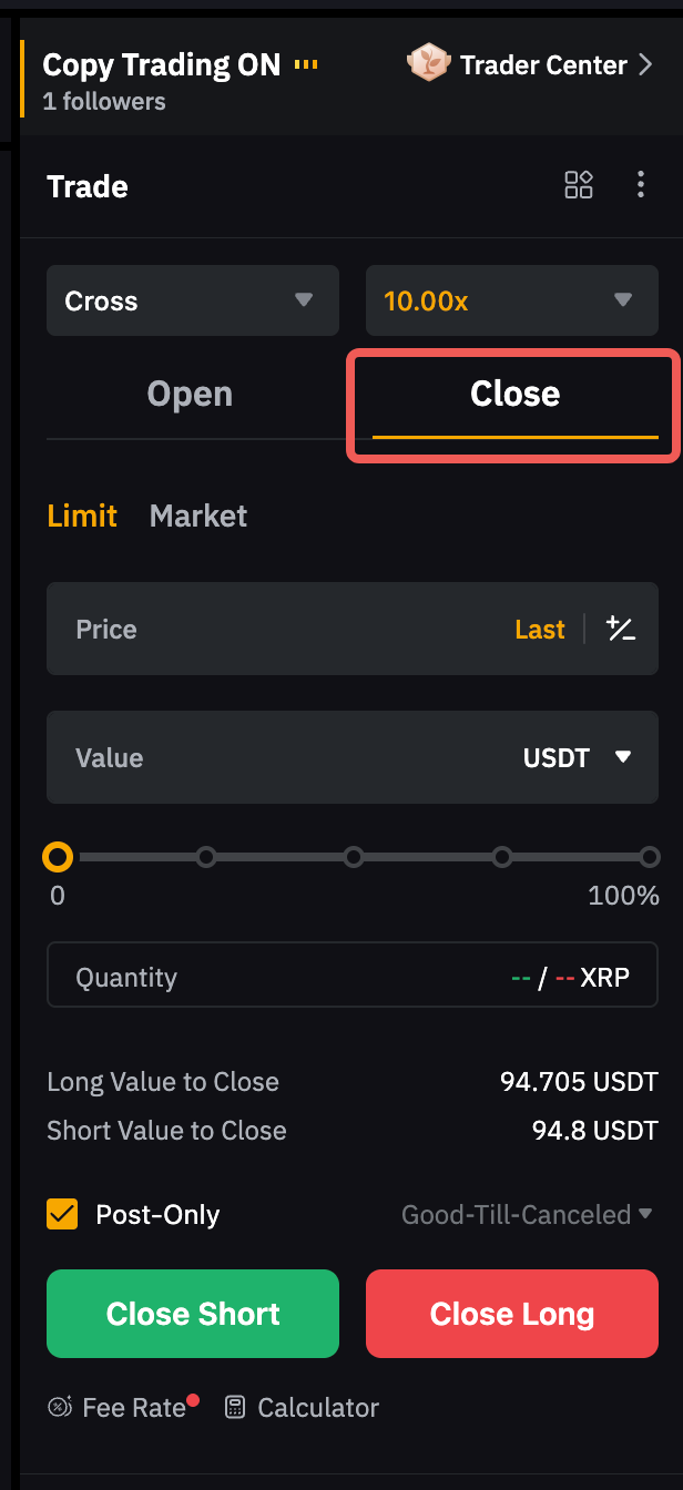 Кроме того, можно разместить ордер на закрытие непосредственно из зоны ордера в режиме хеджирования. Просто заполните информацию о ордере и нажмите Закрыть Лонг/Шорт, в зависимости от направления, в котором вы хотите закрыть ордер.