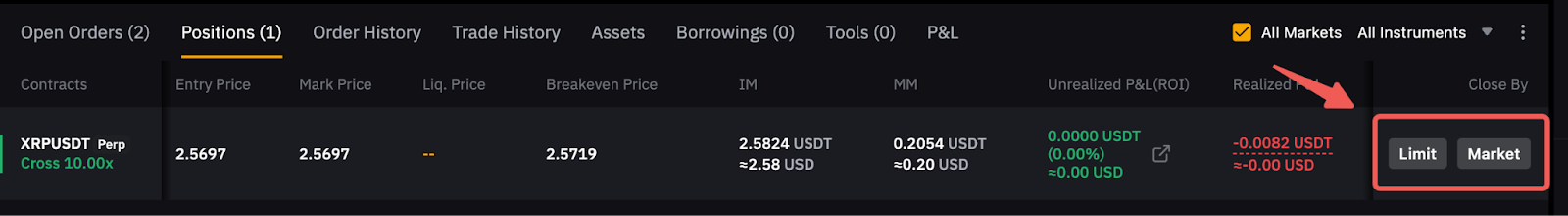 Чтобы закрыть позицию, перейдите на вкладку Позиции, и вы можете закрыть ее лимитным или рыночным ордером. Если вы хотите закрыть ее с помощью других стратегий, таких как условный ордер, вы можете либо воспользоваться нашей встроенной функцией TP/SL (для режима хеджирования), либо разместить ее из зоны ордера в одностороннем режиме.