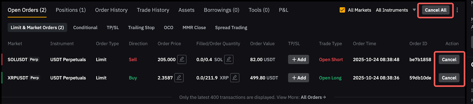 Чтобы отменить ордер, перейдите на вкладку Открытые ордера на странице Бессрочная торговля.