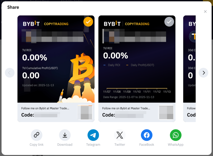 Чтобы поделиться своим профилем, нажмите кнопку Поделиться, расположенную в правом верхнем углу страницы Центра трейдера. Вы также можете нажать Поделиться на странице портфолио Мастера трейдинга.
