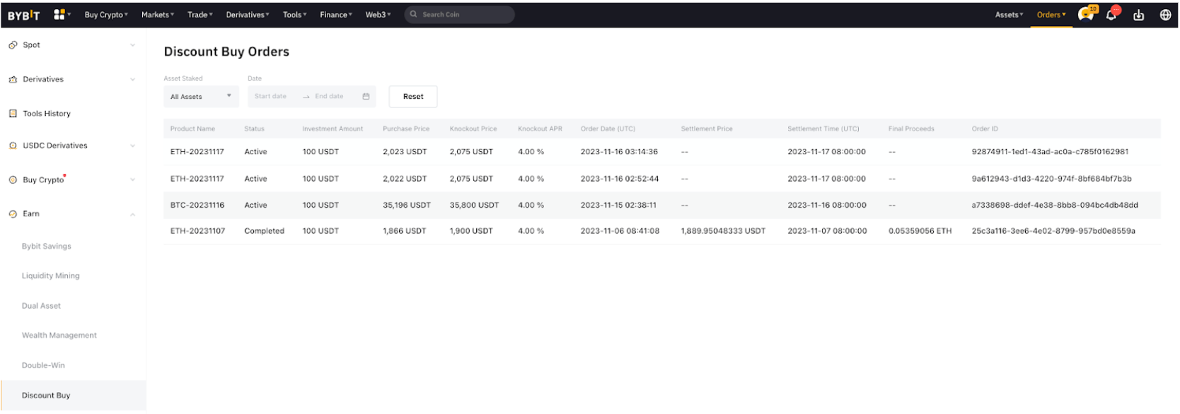 Помимо этого, чтобы перейти на страницу Earn аккаунта, можно нажать на «Активы» в верхнем правом углу страницы Bybit. С этой страницы можно просматривать все имеющиеся ордера.