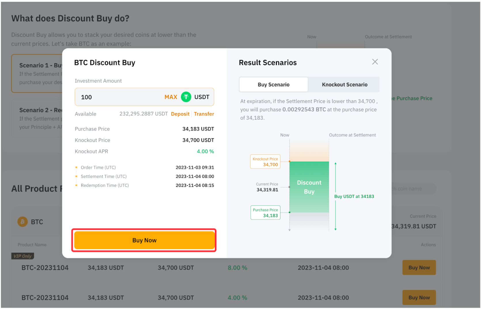 - Если цена расчёта равна цене нокаута или выше этой цены, пользователь получит возврат основной суммы и дополнительный доход в виде APR (в USDT).