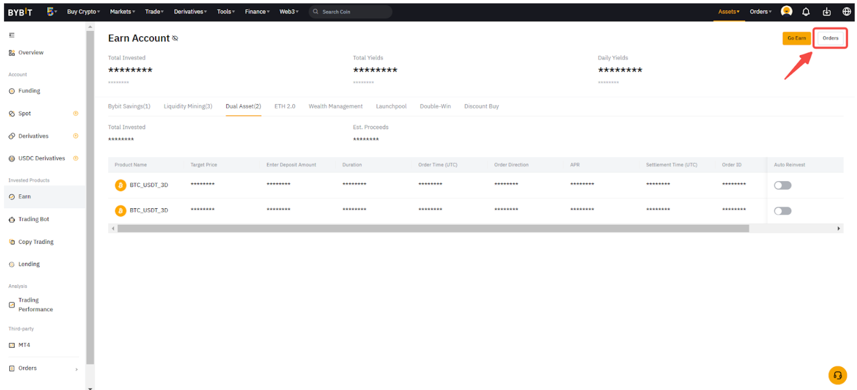 Чтобы открыть историю ордеров на Бивалютные инвестиции, перейдите на вкладку Бивалютные инвестиции или нажмите Ордера в правом верхнем углу страницы.
