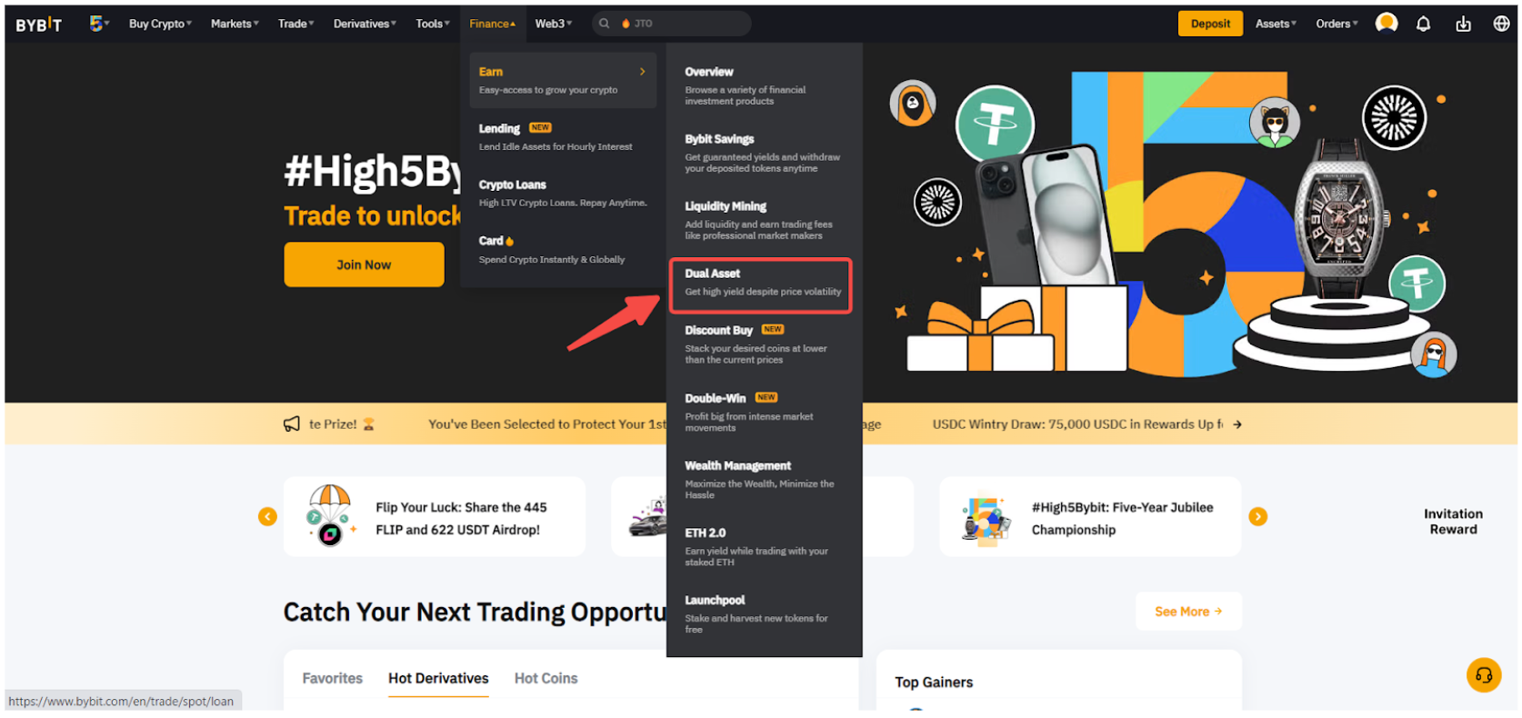Шаг 1. Для перехода на страницу Бивалютных инвестиций в панели навигации нажмите Финансы → Earn Бивалютные инвестиции.
