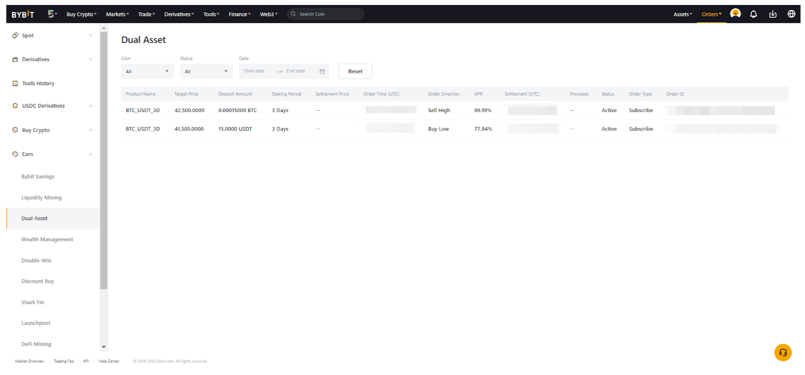 • История ордеров на Бивалютные инвестиции: на этой странице также будет указан статус ваших ордеров, а также эффективная прибыль и цена расчёта для всех завершенных планов Бивалютных инвестиций.