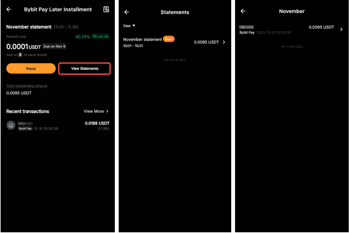 From there, switch between the Transaction, Repayment and Liquidation tabs to view relevant details. Tap any transaction to open its Payment Details page, and tap the right arrow icon in the Bybit Pay Later section for more information.
