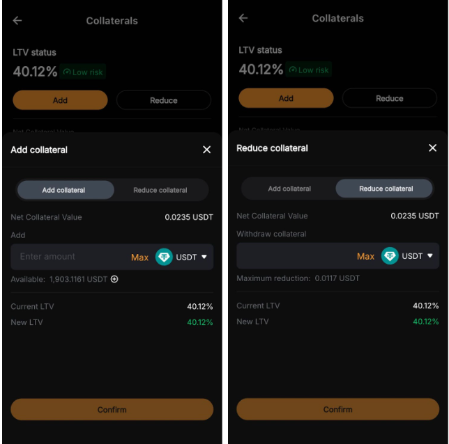 Reduce: Opens the Reduce collateral tab. Choose the collateral token and enter the amount you'd like to reduce, or tap Max to remove the maximum allowable amount. Reducing collateral raises your LTV and increases liquidation risk.