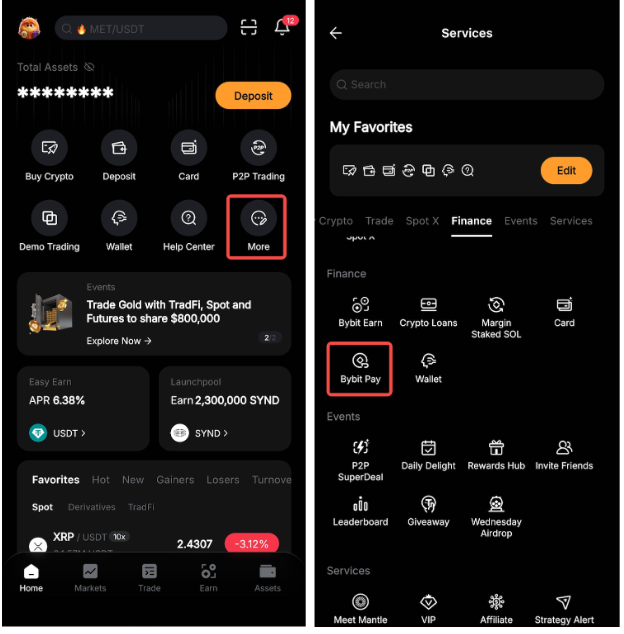 The Bybit App homepage: Tap More, find Bybit Pay under Finance, and tap Activate Bybit Pay.