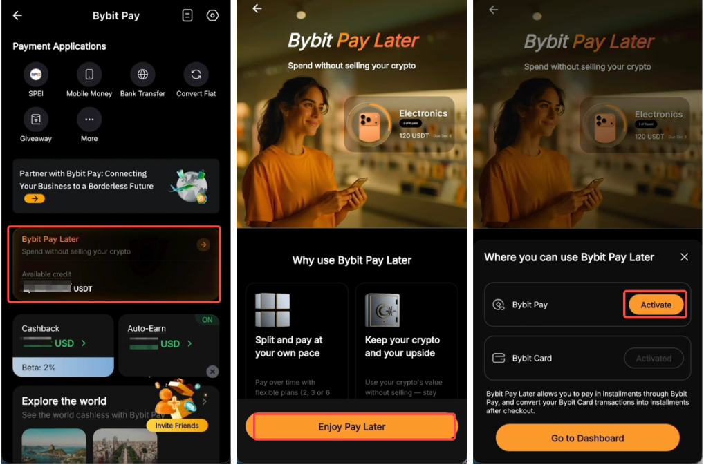 The Pay Later homepage (accessible via both the Bybit Card and Bybit Pay homepages): Tap Enjoy Pay Later, then select Activate for Bybit Pay on the pop-up page.