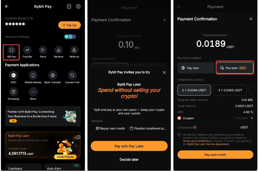 Step 2: Make a purchase using Bybit Pay's QR Pay feature on the Bybit App. On the checkout page, select Pay Later and tap Confirm. If you're a first-time user, choose Pay with Pay Later to proceed.