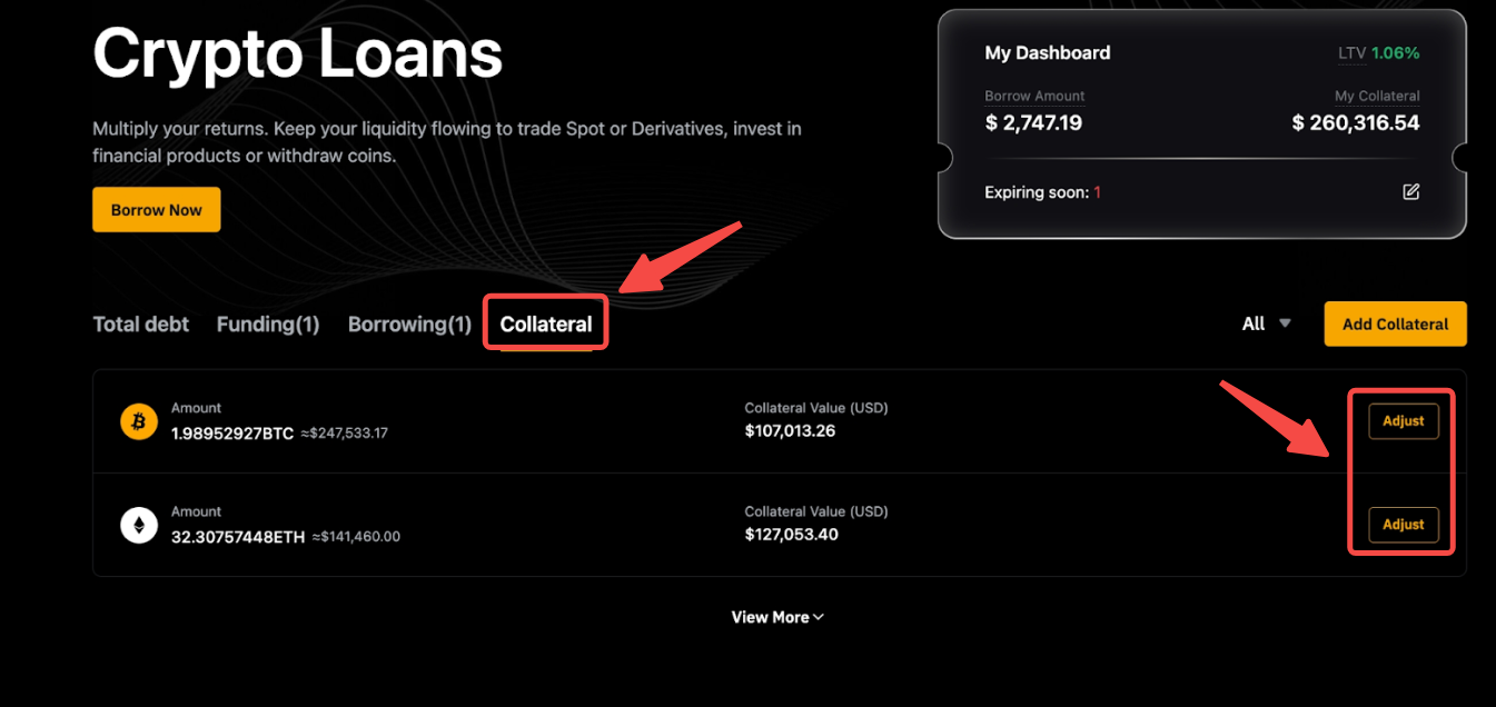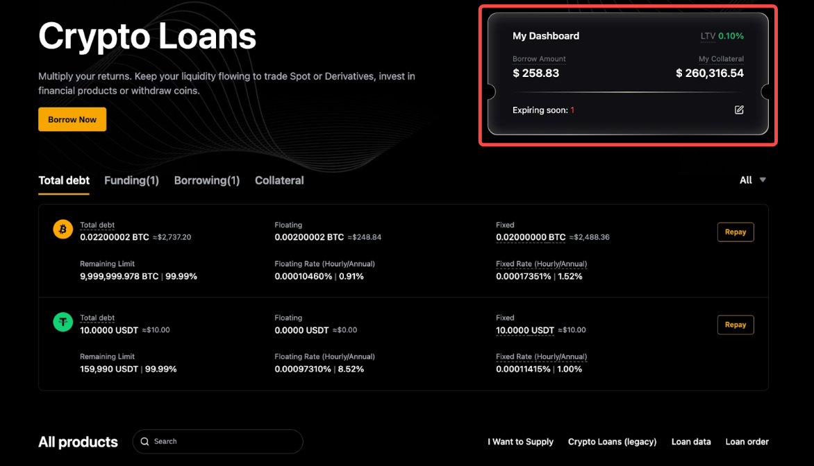 Чтобы проверить свои займы, перейдите на страницу Криптозаймы, где вы увидите общие суммы займов, обеспечения и ордеров.