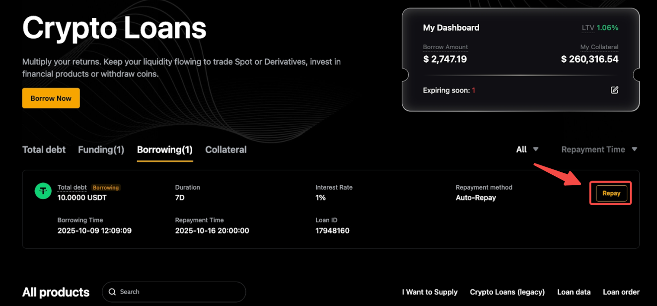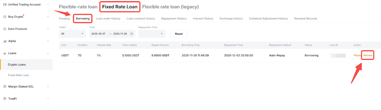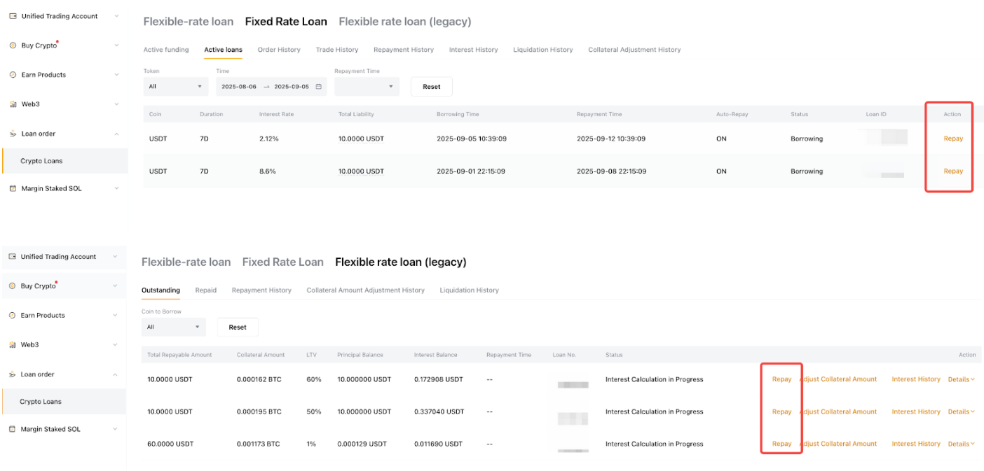— Если Автопогашение включено для займов с фиксированной ставкой, активы в аккаунте Финансирования будут автоматически использоваться для погашения займа в дату расчета. Это поможет избежать штрафа за просрочку. Убедитесь, что на аккаунте достаточно средств для полного погашения. В противном случае автоматическое погашение не будет выполнено.