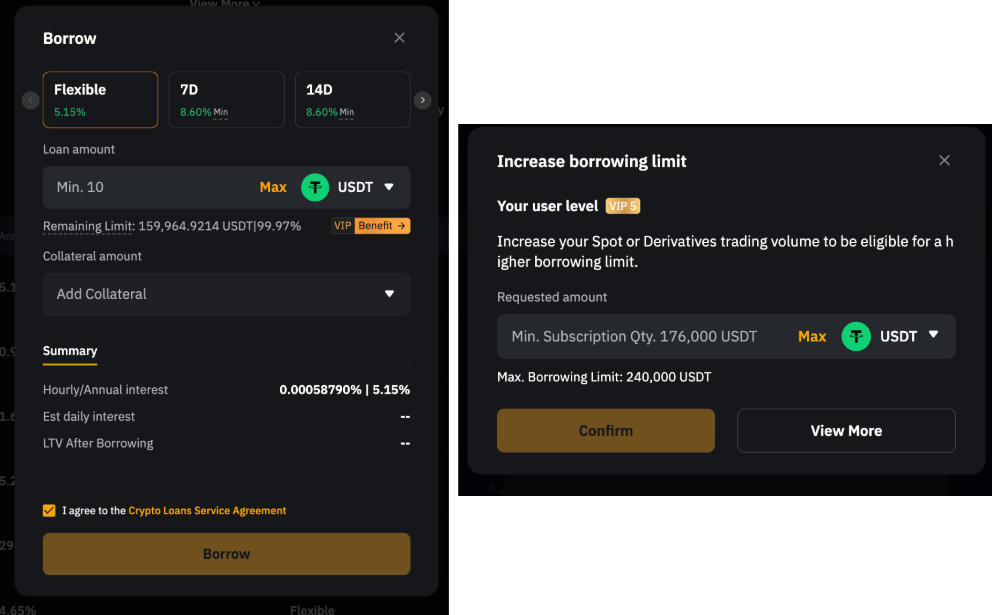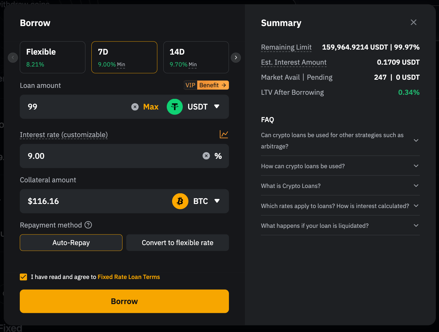 - Сумма займа: Нажмите Макс, чтобы получить максимальную сумму займа на основе стоимости обеспечения и лимита займа актива.
