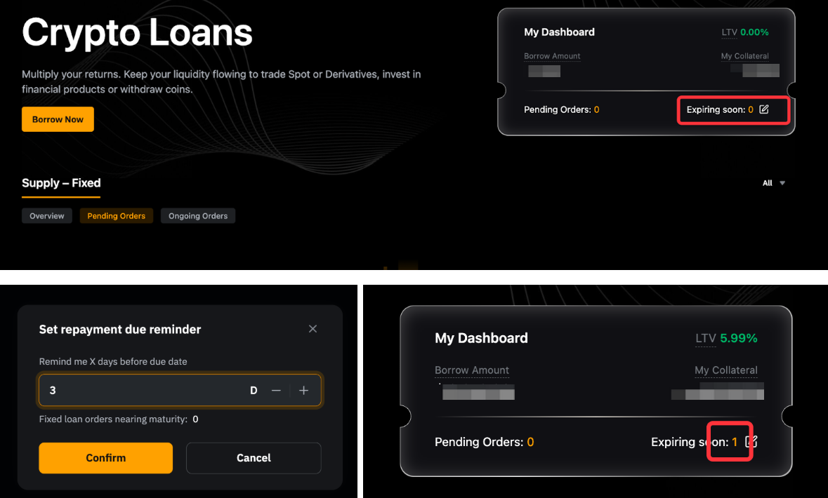 — Вы также можете включить напоминание о “сроке погашения”. Для этого перейдите на главную страницу Криптозайма и нажмите на значок редактирования рядом с надписью Скоро истекает в Панели управления, чтобы указать количество дней до даты погашения. После наступления срока погашения количество продуктов с истекающим сроком действия будет отображаться рядом с надписью Скоро истекает.