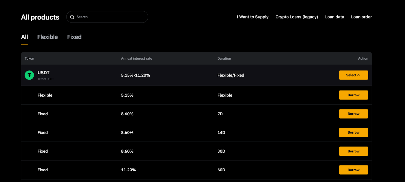 Шаг 2. В разделе Все продукты вы найдете варианты займов как с гибкой, так и с фиксированной ставкой. Выберите или найдите актив, который хотите занять, чтобы просмотреть доступные сроки и соответствующие процентные ставки. Нажмите Оформить заем для подходящего варианта.