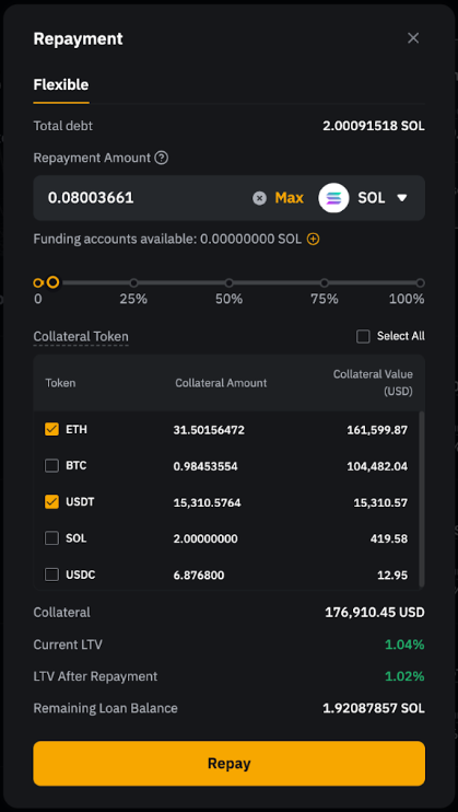 Кроме того, для погашения можно выбрать более одного типа обеспечения. Проверьте детали погашения во всплывающем окне подтверждения и нажмите Погасить. При погашении криптозайма залоговыми монетами взимается комиссия. Ставка комиссии — это наибольшая из ставок комиссии за погашение для залогового и долгового активов.